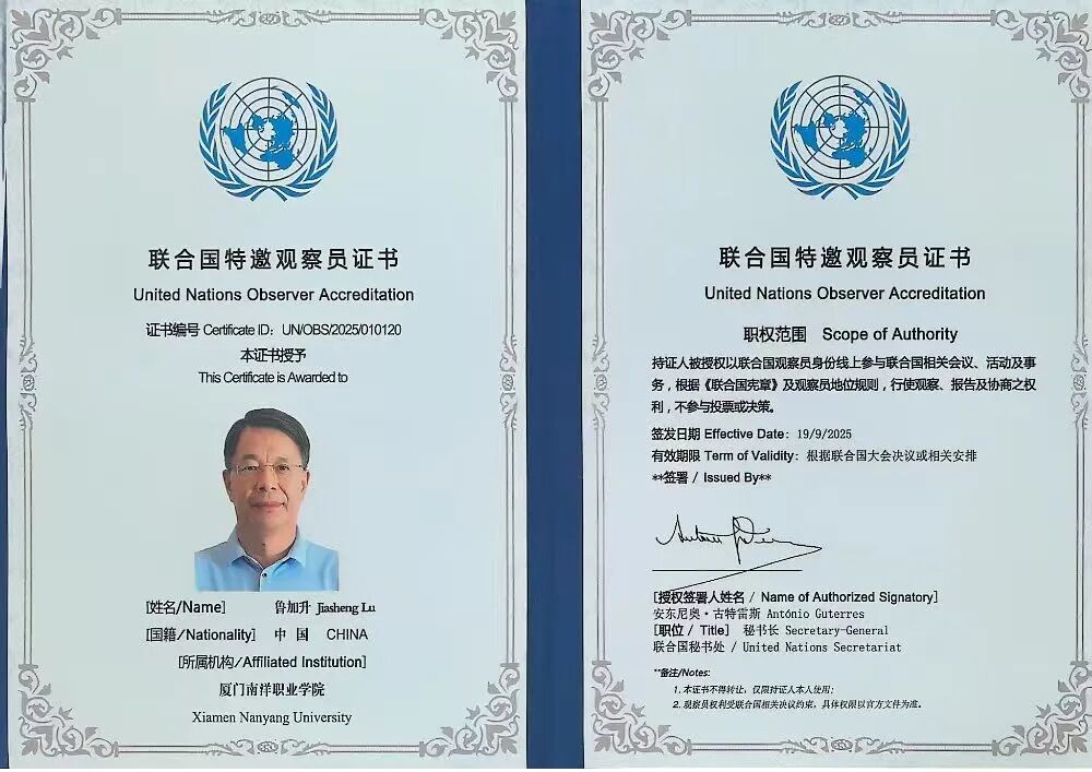 我校创办人、南洋教育投资董事长鲁加升教授获颁联合国特邀观察员证书,被授权以联合国观察员身份参与联合国相关会议、活动。此前,在今年9月22日,鲁加升教授作为国家观察员代表,应邀线上出席第80届联合国大会,聆听李强总理等各国领导人及各界政要的演讲、发言、辩论。