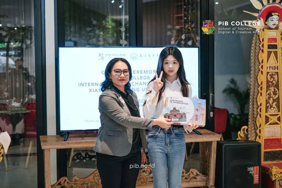 2025年4月25日,巴厘岛理工学院老师Erika在结营典礼上为学生李嘉欣颁发研学证书